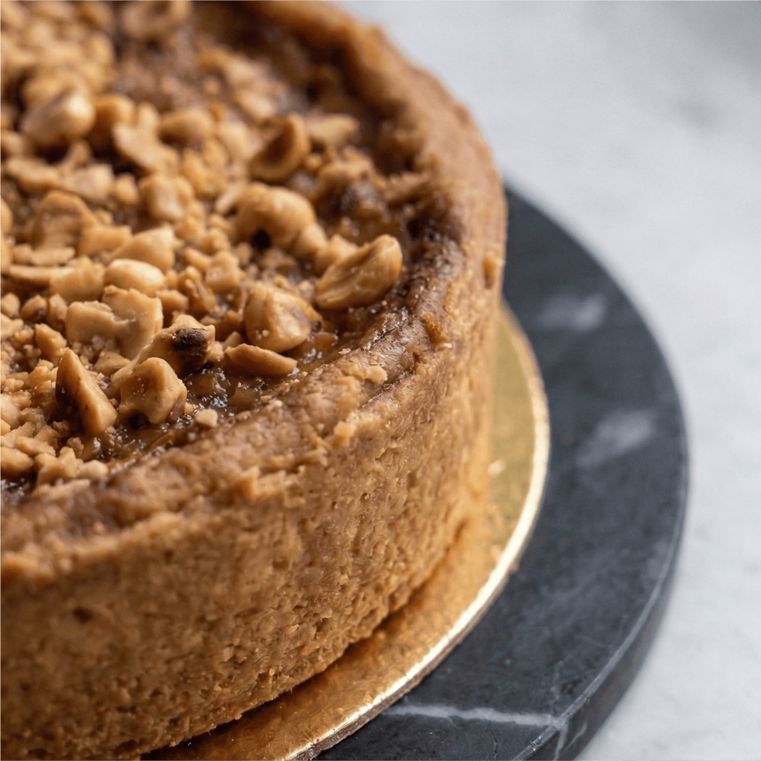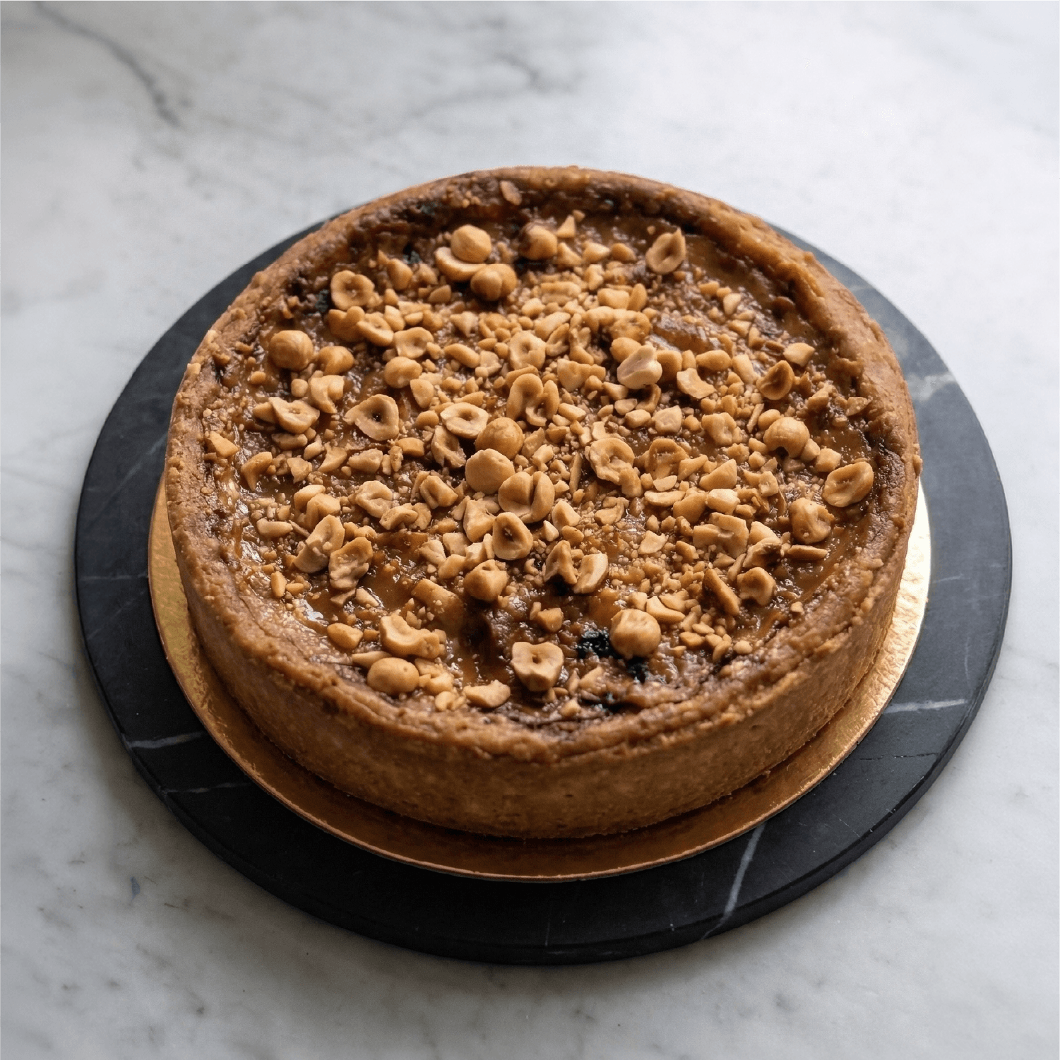 Pâte brisée pur beurre, appareil crémeux au chocolat au lait, praliné, noisettes.