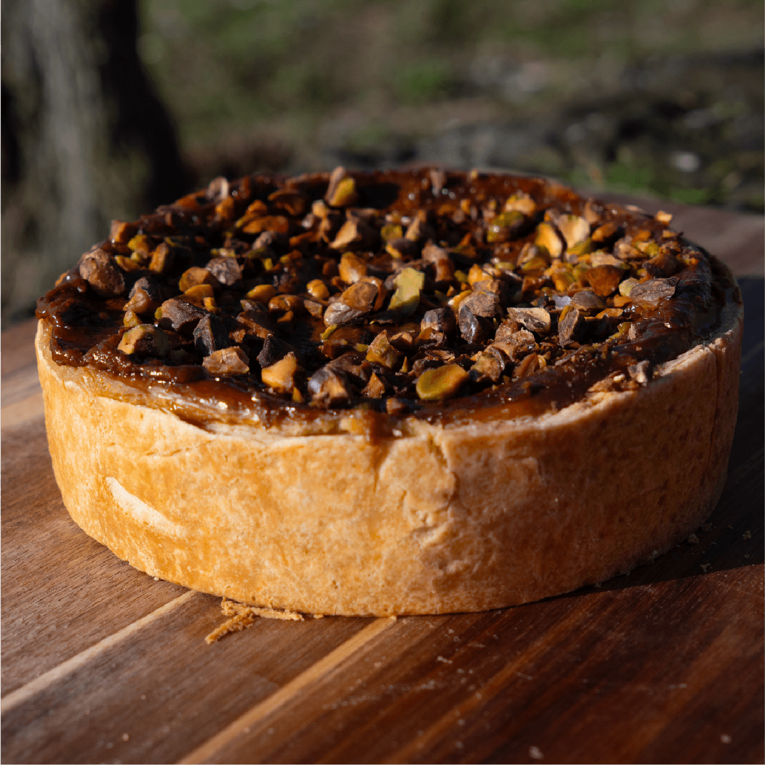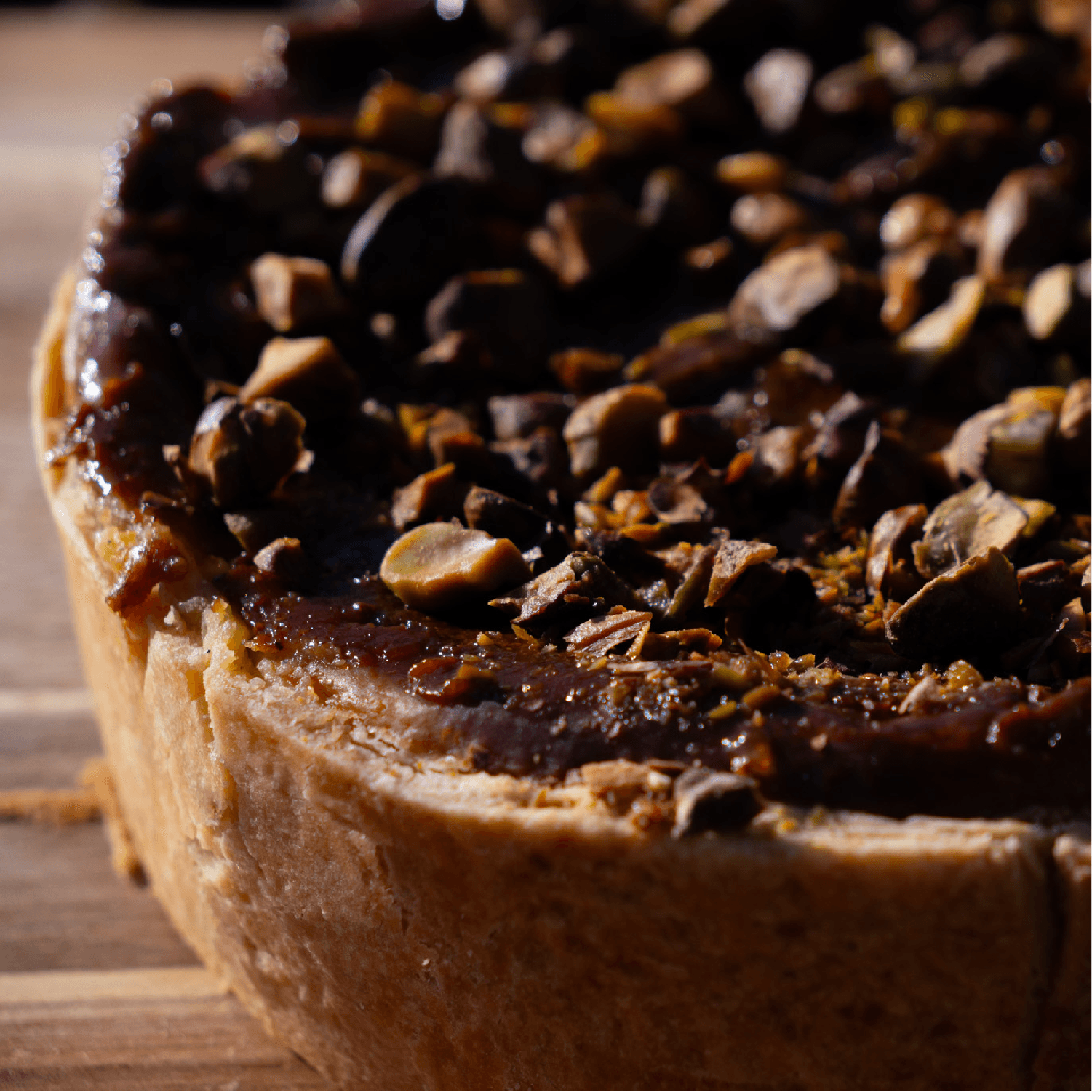 Pâte brisée pur beurre, appareil crémeux à la pistache, praliné pistache.