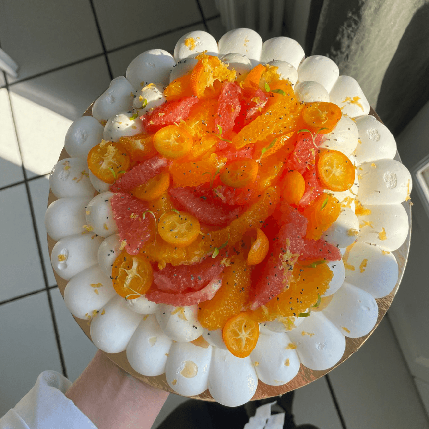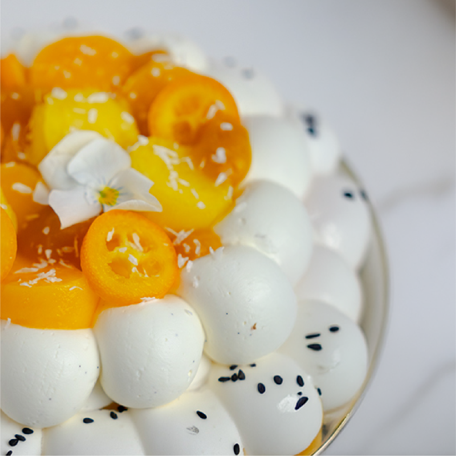 Meringue craquante, ganache montée vanille de Madagascar, fruit de saison.