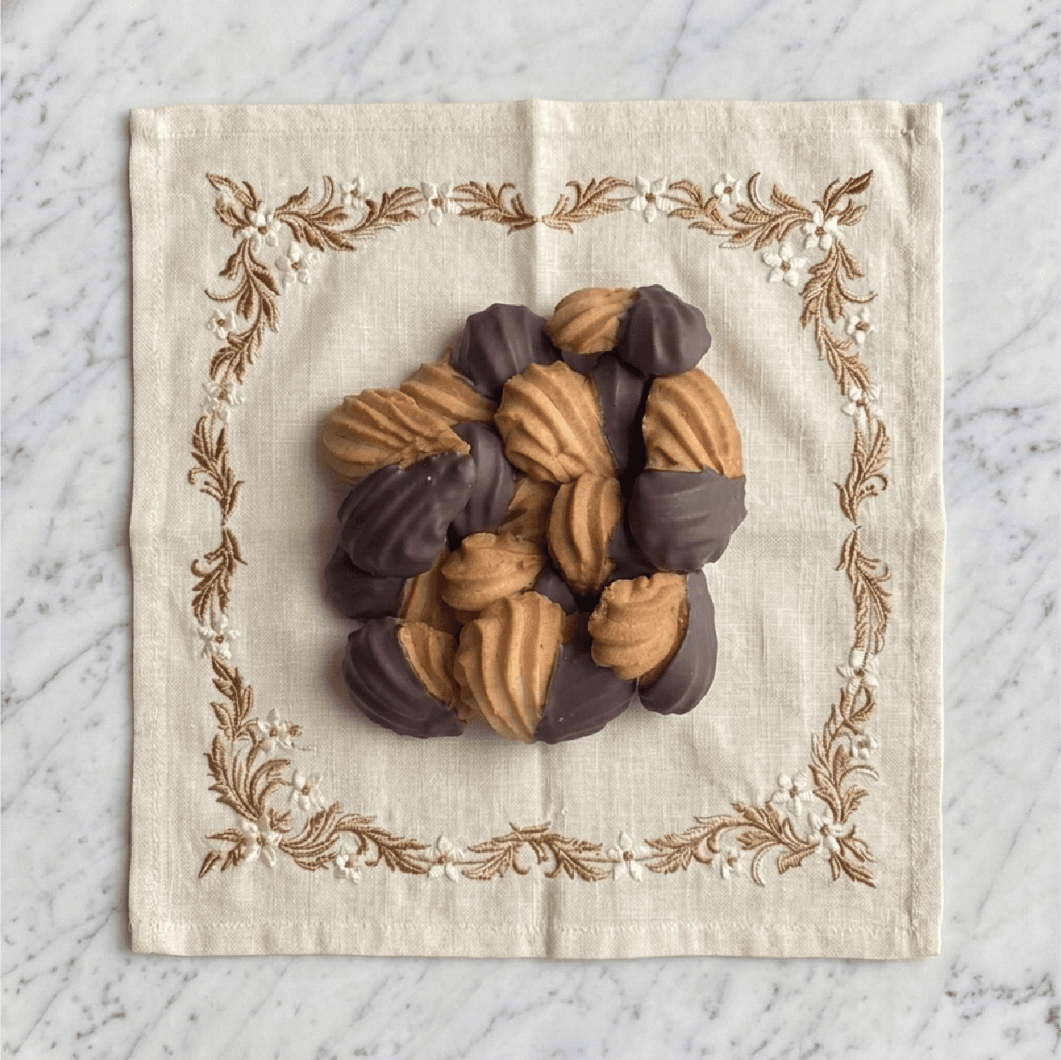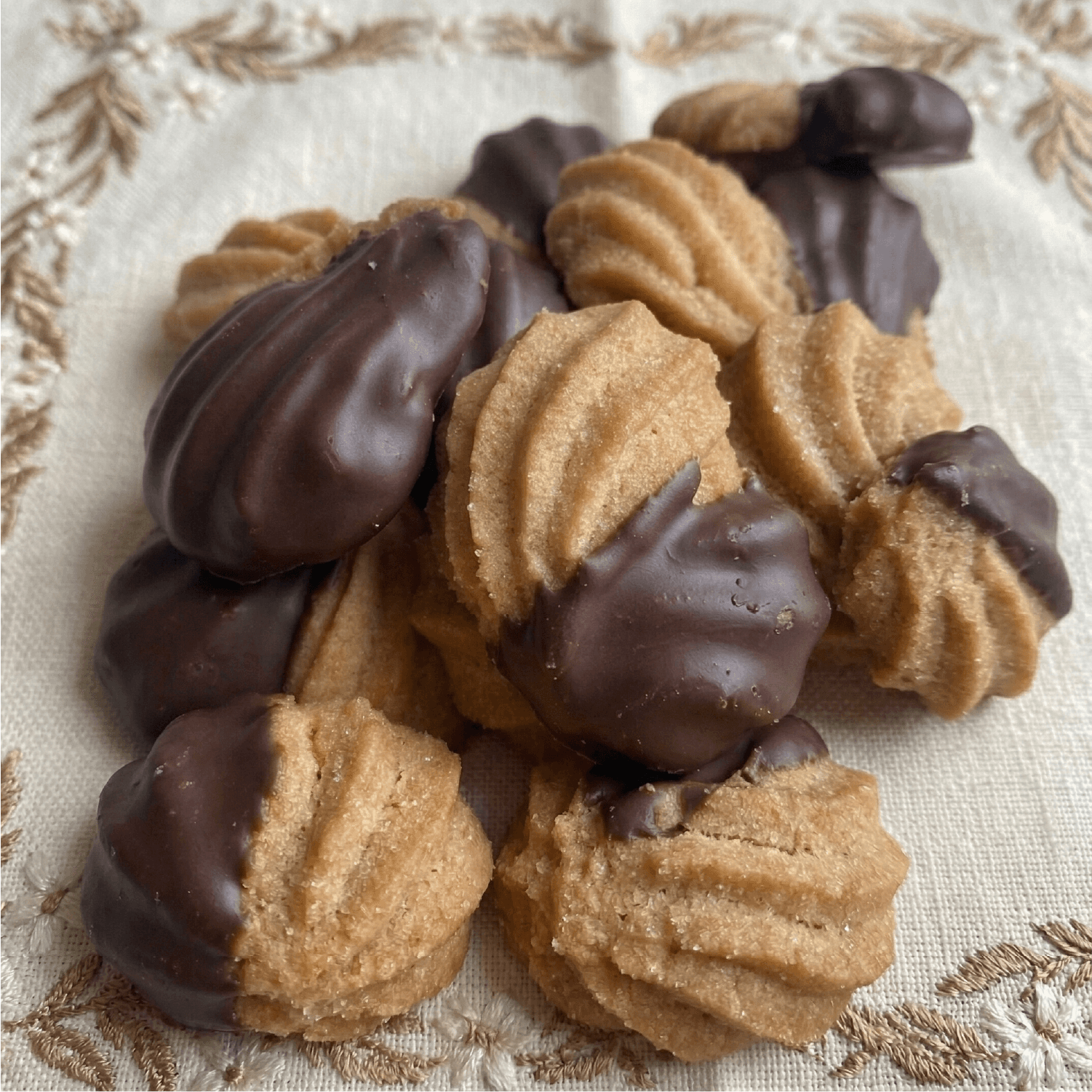 Beurre, blanc d'oeuf, sucre, farine de blé, chocolat noir Valhrona 54%.